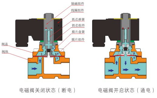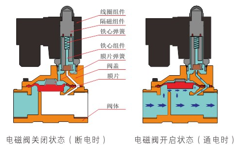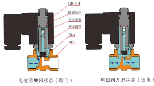 原理:华体会在线登录官网-华体会(中国)直动式电磁阀分常闭型和常开型两种。常闭型电磁阀断电时为关闭状态,线圈通电时产生电磁力,动铁芯跟静铁芯吸合,电磁阀阀口打开,介质(流体)通过;当电磁阀线圈断电时电磁阀消失,在弹簧的作用力下,电磁阀动铁芯复位,阀口关闭,介质(流体)不同,电磁阀呈关闭状态。常开型与之相反。